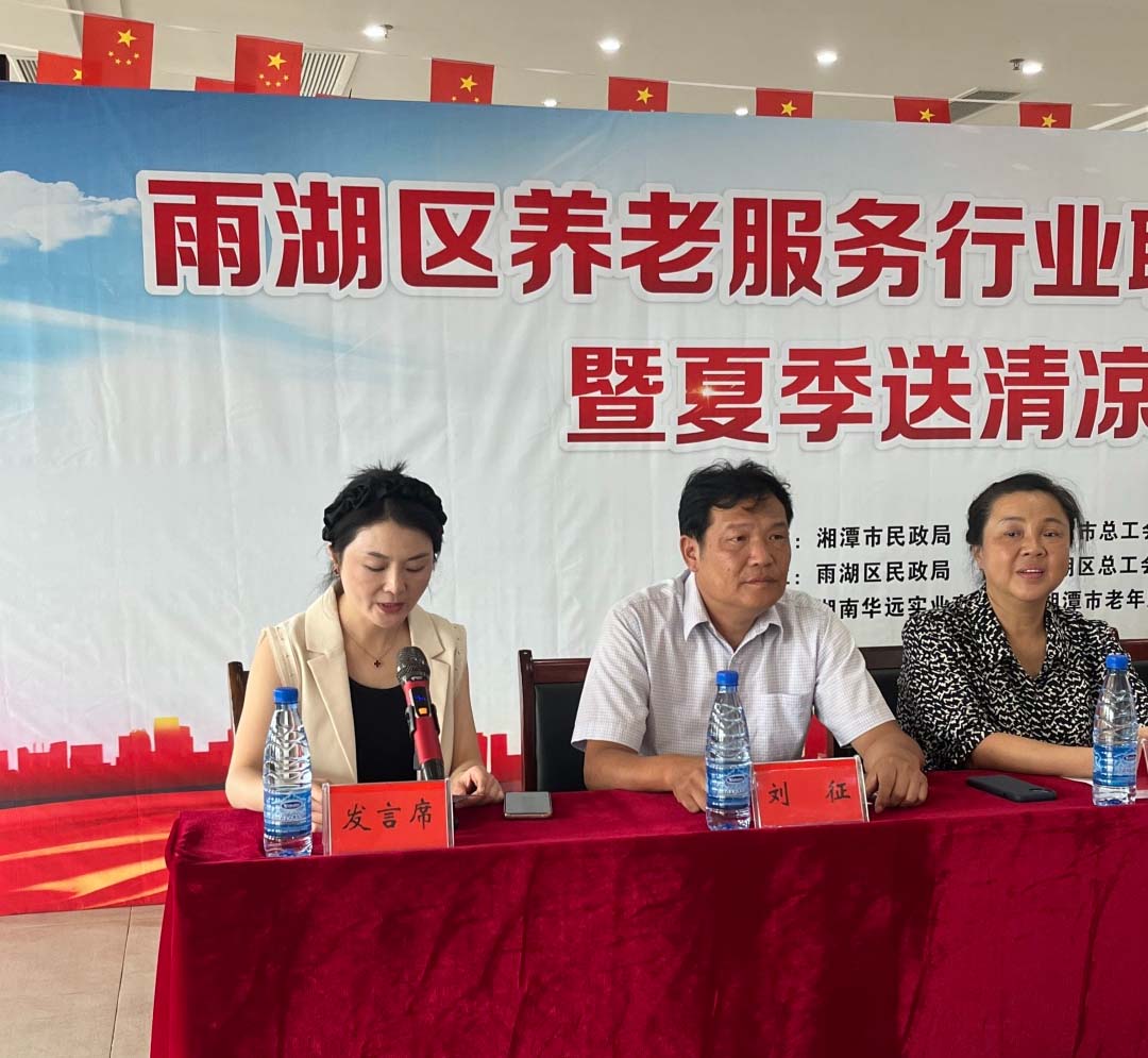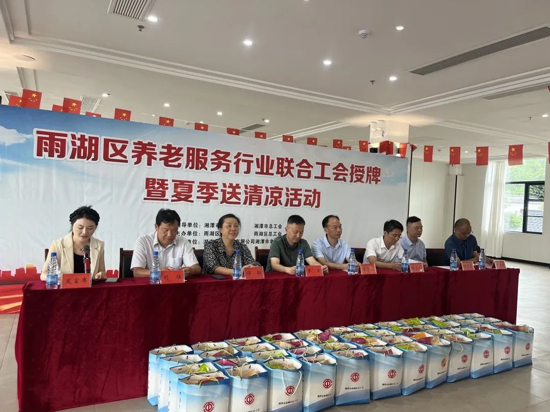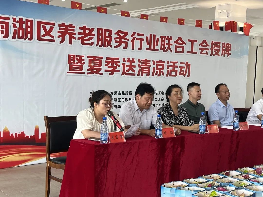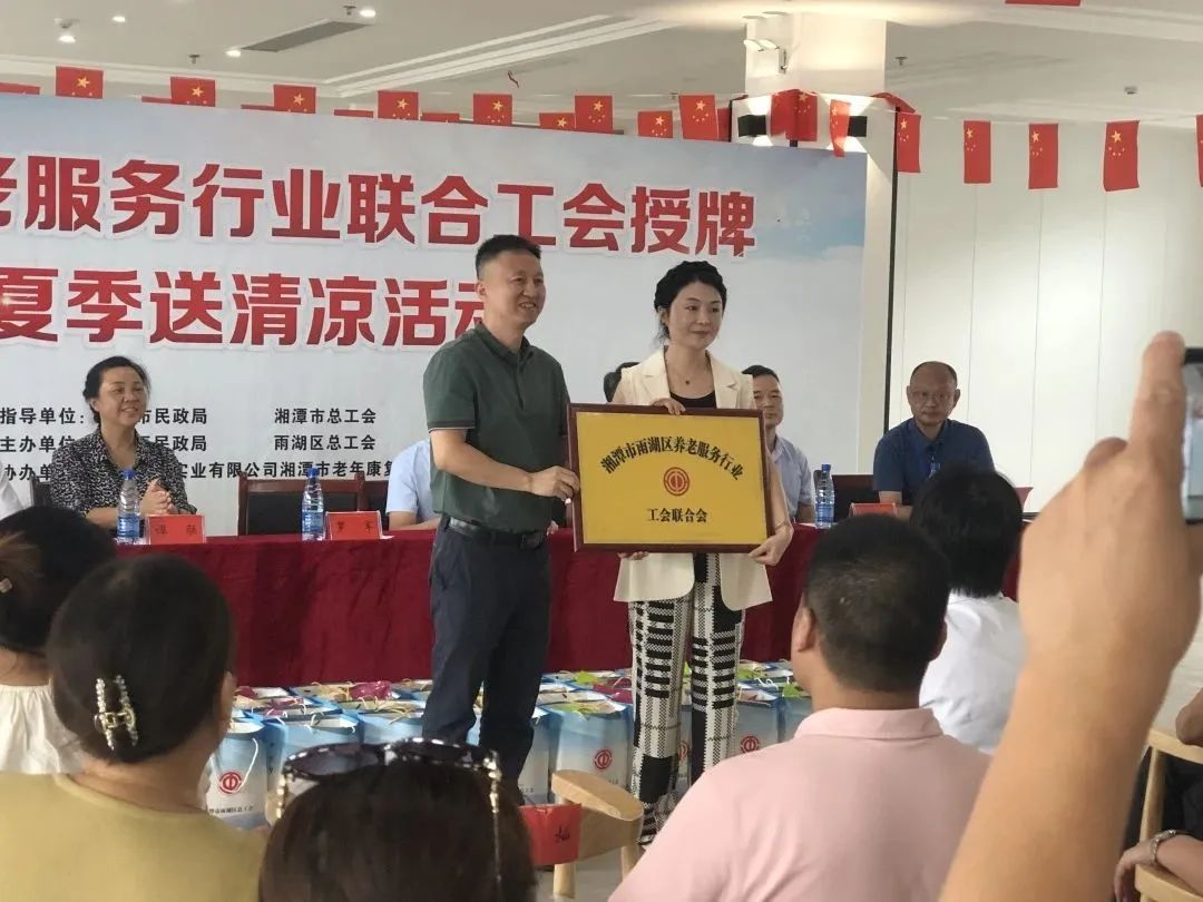 8月23日,雨湖區(qū)養(yǎng)老服務(wù)行業(yè)聯(lián)合工會授牌儀式暨夏季送清涼活動在我院舉行。區(qū)總工會黨組書記、常務(wù)副主席劉征,人大常委會副主任、區(qū)總工會主席譚聯(lián),市總工會黨組成員、副主席羅軍,湘潭市民政局黨委委員、副局長韓賢海,雨湖區(qū)委副書記蔣文武,市工會組織部部長劉志勇,以及來自雨湖區(qū)各養(yǎng)老機(jī)構(gòu)的負(fù)責(zé)人代表參會,雨湖區(qū)民政局黨組書記、局長干建暉主持會議,華遠(yuǎn)康養(yǎng)中心法人譚燦任首屆工會主席。